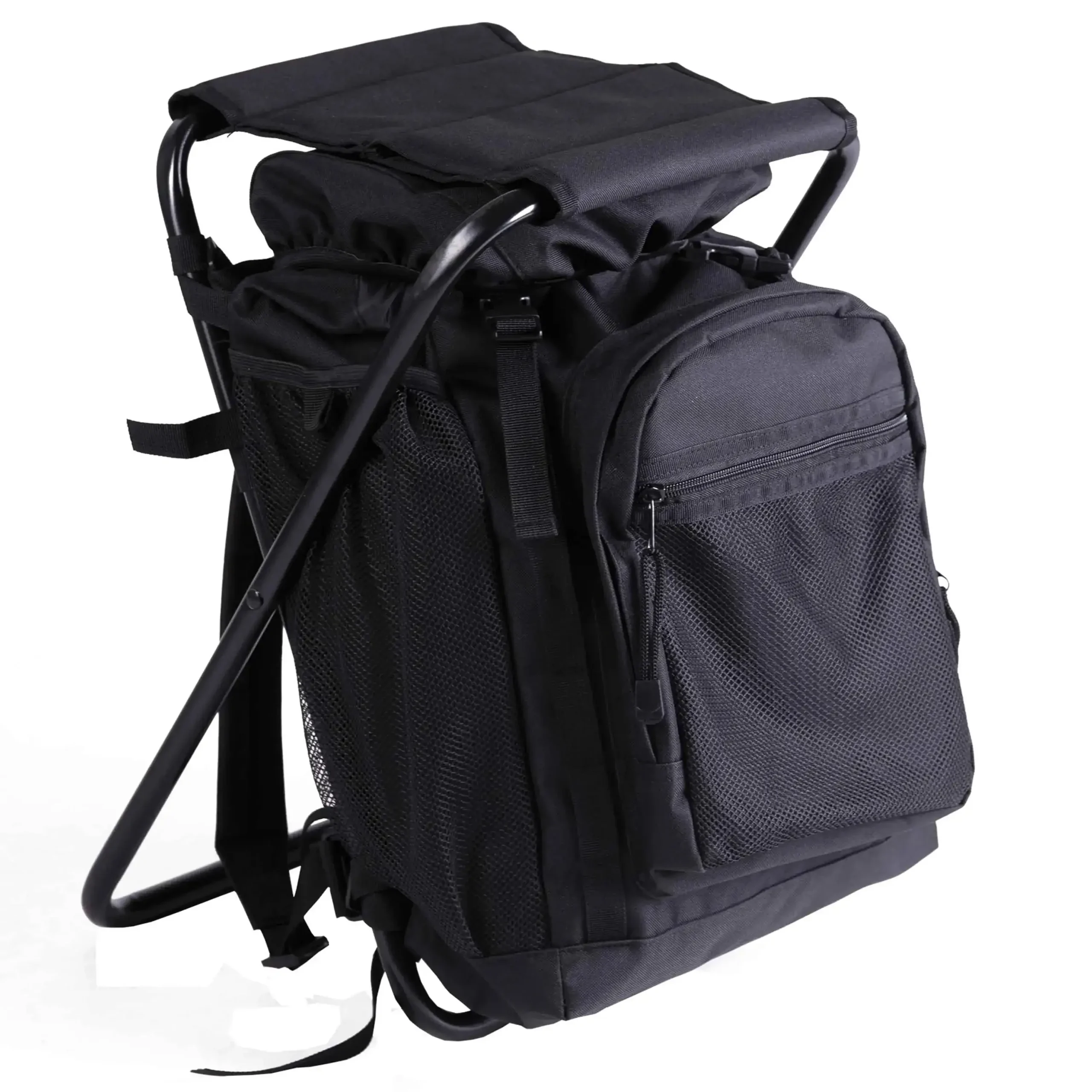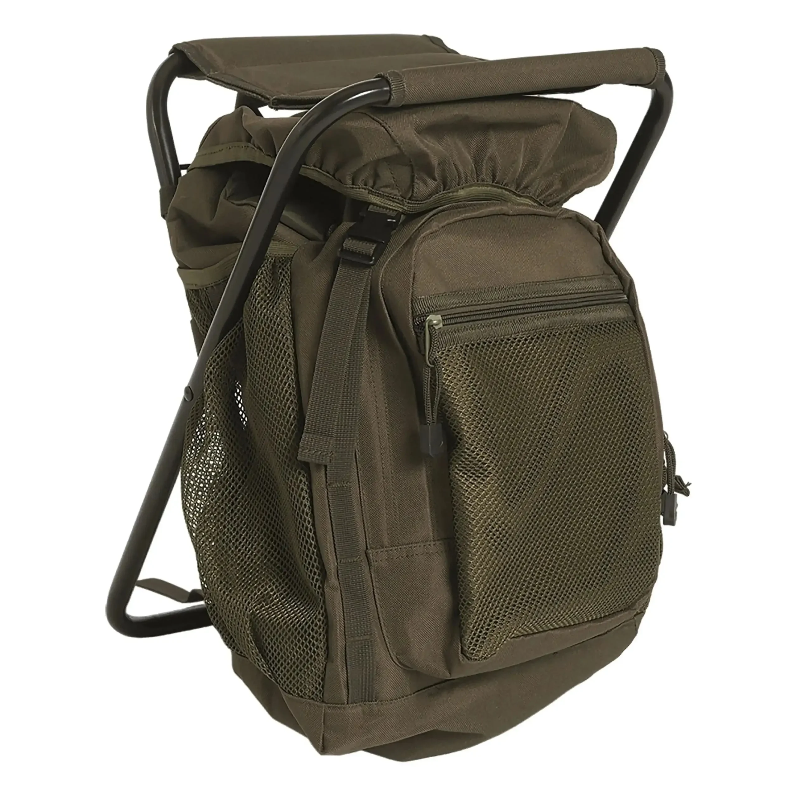 Dieser Rucksack mit Hocker ist ein idealer Outdoorbegleiter. Durch die breite Bodenfläche steht er auch auf unebenem Gelände sicher und ist mit seinem Klapprahmen aus Eisen robust und trotzdem gut zu tragen. Im großzügig bemessenen Hauptfach des Rucksacks und in den Netztaschen findet alles Platz, was man bei der Outdoortour dabeihaben will