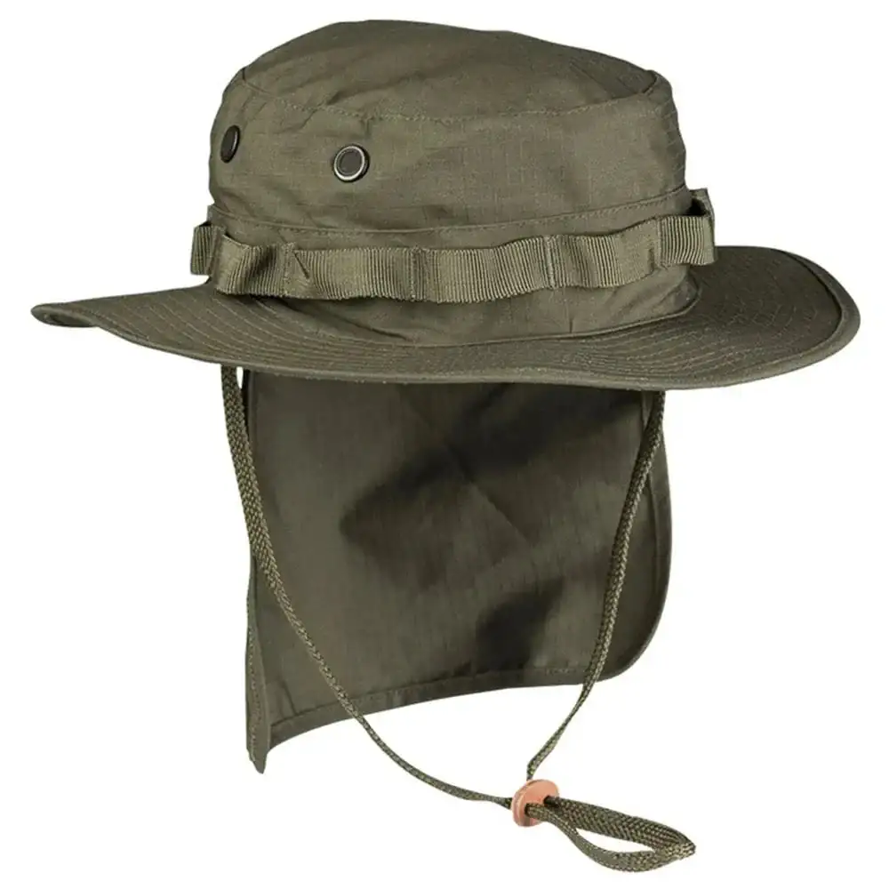 Klassischer Boonie Hat aus robustem Ripstop-Material. Das Besondere ist hier der Nackenschutz, welcher am Hut angebracht ist und gegen Wind, Sonne oder Staub schützt. An den Molle-Schlaufen lassen sich Ausrüstungsgegenstände oder Tarnmaterial anbringen.