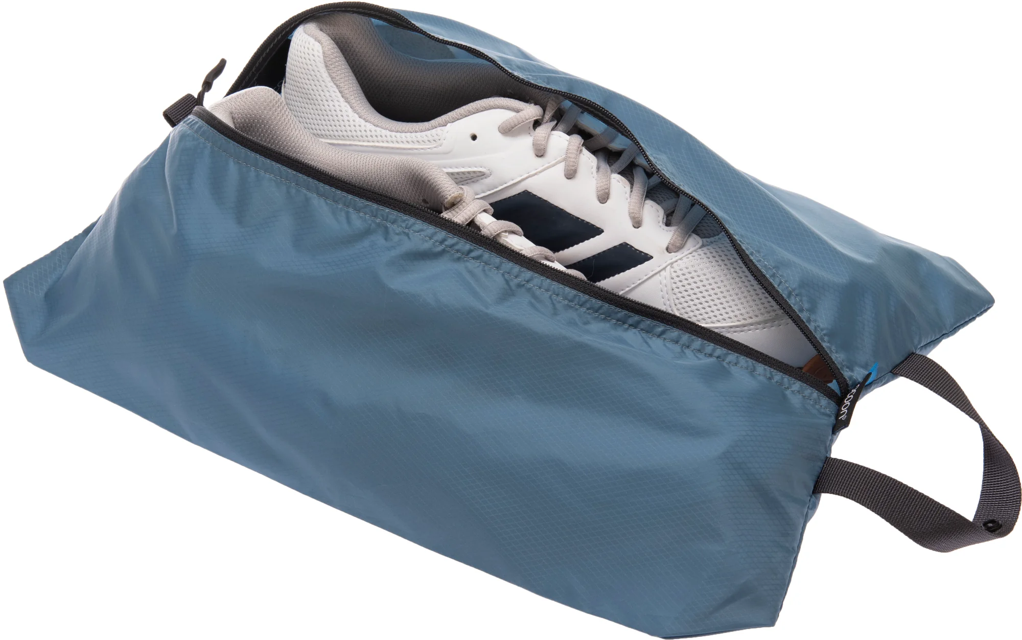 Weicher, wasserabweisender, innen laminierter Schuhsack zum Mitführen von auch feuchten und schmutzigen Schuhen im Reisegepäck. Mit herausnehmbaren Trennwänden zur individuellen Anpassung. Klein zusammenfaltbar. Für bis zu drei Paar Schuhe. Mit YKK Zipper