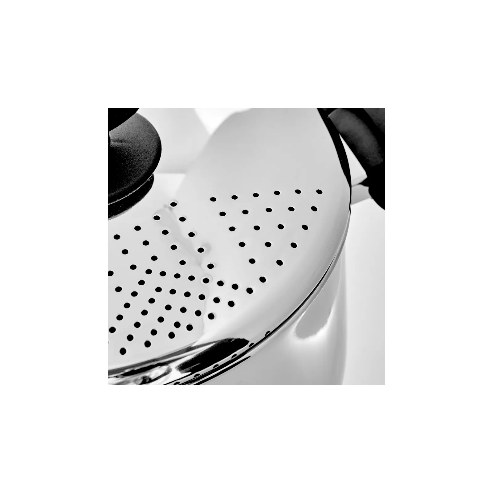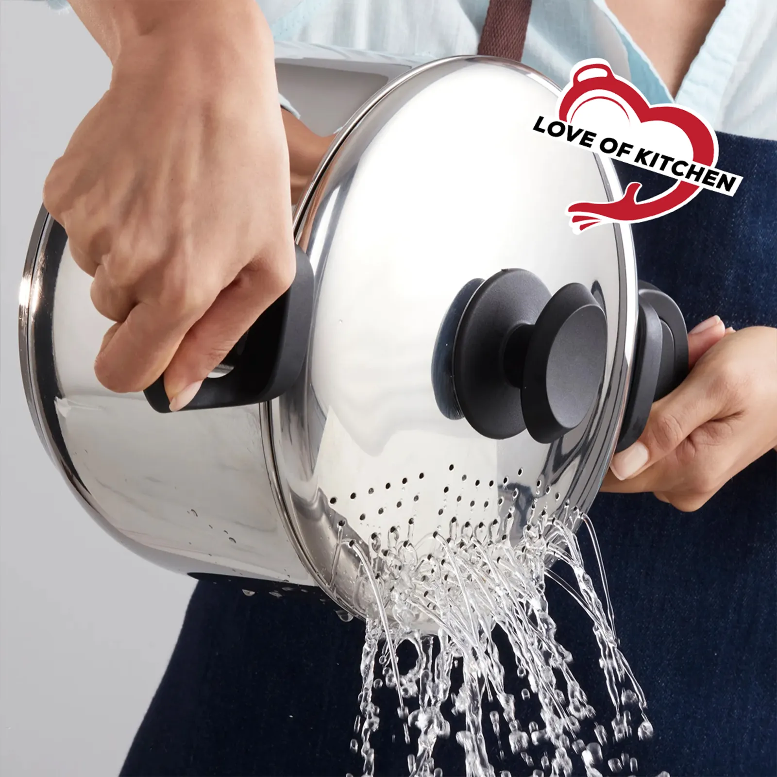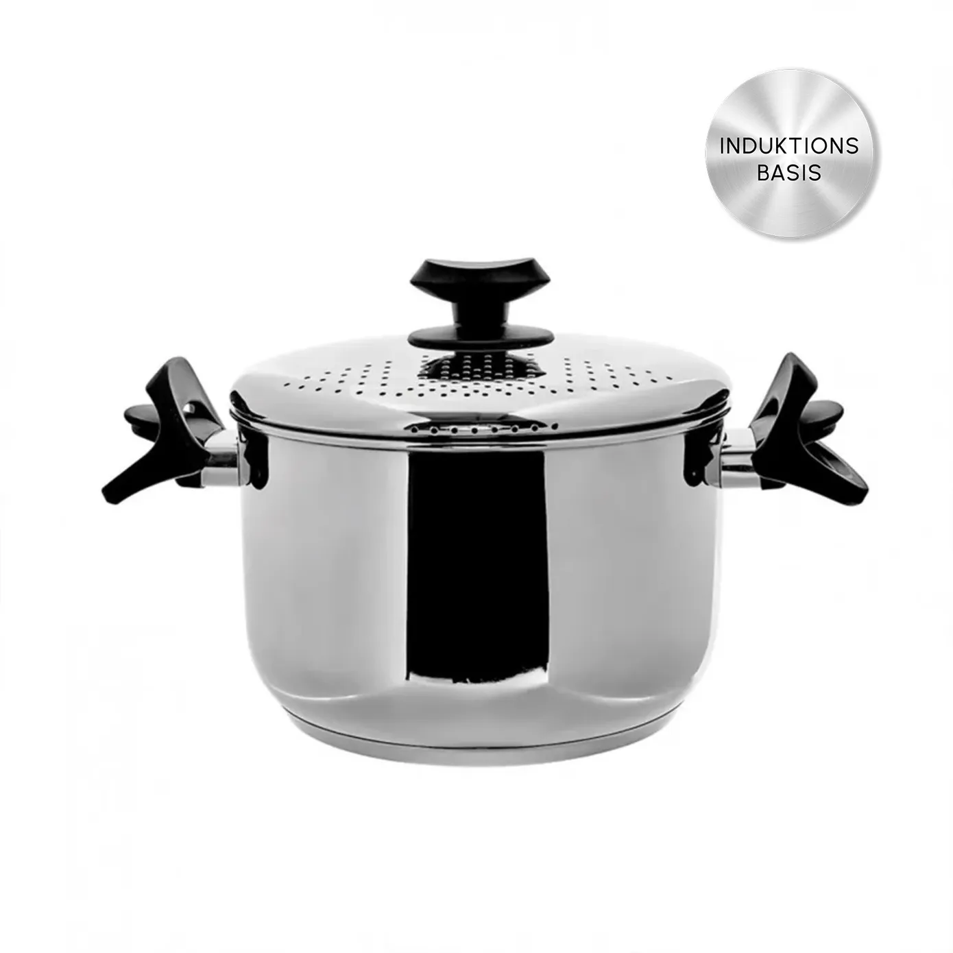 - mit dem arretierbaren Topfdeckel und dem auf den Topfdeckel eingestanzten Löcher können Sie das Kochwasser einfach direkt und sicher aus dem Topf ausgießen. So sparen Sie sich ein zusätzliches Sieb!