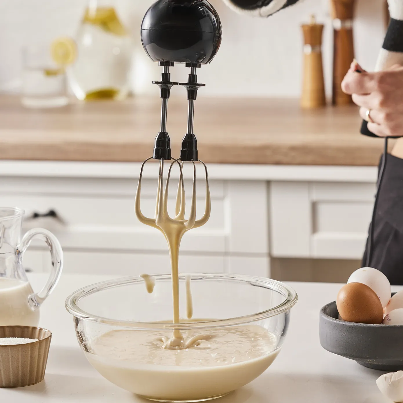 Mit dem Schneebesenaufsatz können Sie mühelos Mischungen wie Eier, Sahne und Kuchen zubereiten.