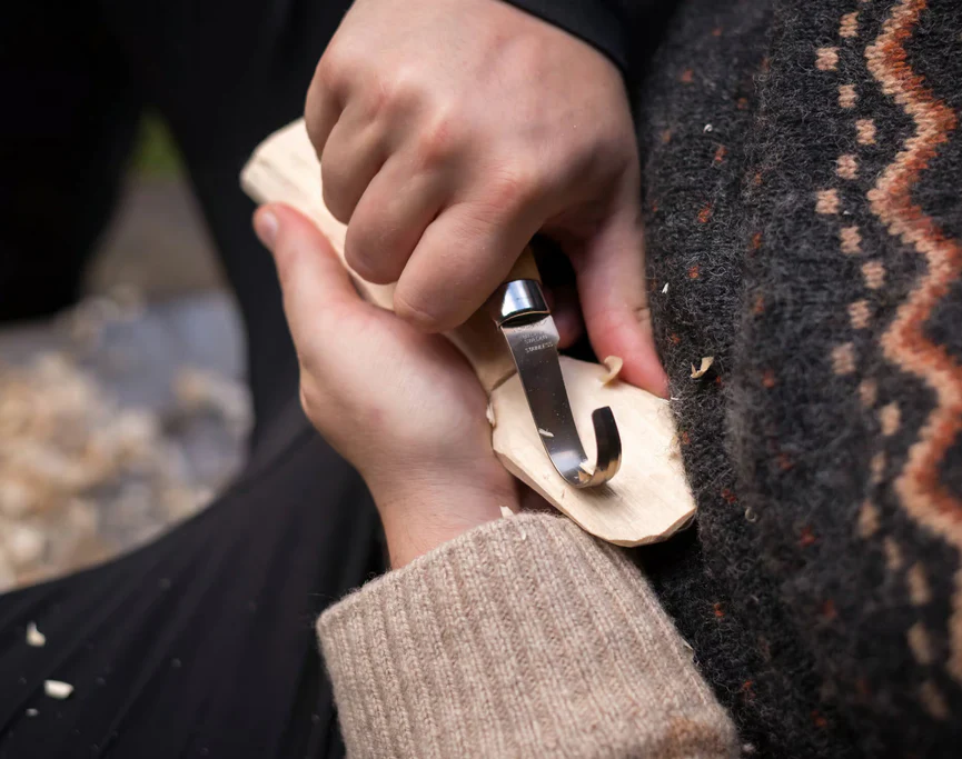 Dieses speziell entwickelte Schnitzmesser mit enger, geschliffener Krümmung wurde für Kunsthandwerker:innen weltweit entworfen. Die recycelte Edelstahlklinge aus Schweden eignet sich perfekt für ziehende Schnitzbewegungen beim Aushöhlen von Holzflächen – ideal für Löffel, Schalen oder detailreiche Vertiefungen.
