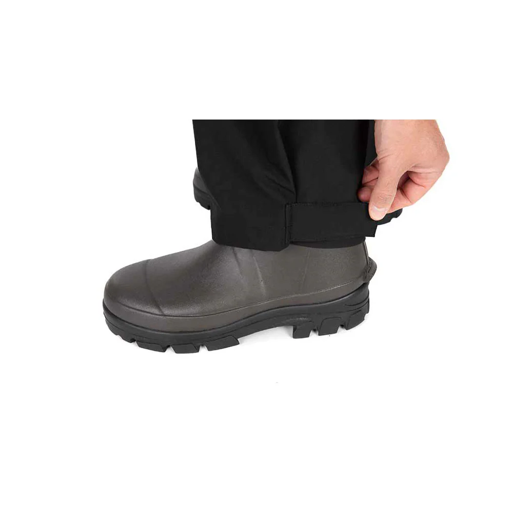 Die Fox Rage Ragewear Rainsuit Salopettes haben jeweils eine Tasche links und rechts an der Hüfte und sind mit versiegelten Reißverschlüssen ausgestattet. Der Inhalt bleibt also trocken. Ebenfalls versiegelt ist der mittig verlaufende Haupt-Reißverschluss der Latzhose, welcher beidseitig geöffnet werden kann. Die Hosenträger sind elastisch, verstellbar und mit einem Schnappverschluss versehen, der sich einfach und schnell öffnen lässt. Ein Klettverschluss an den Hosenbeinen sorgt dafür, dass man die Hosenbeine bei Bedarf enger machen kann.