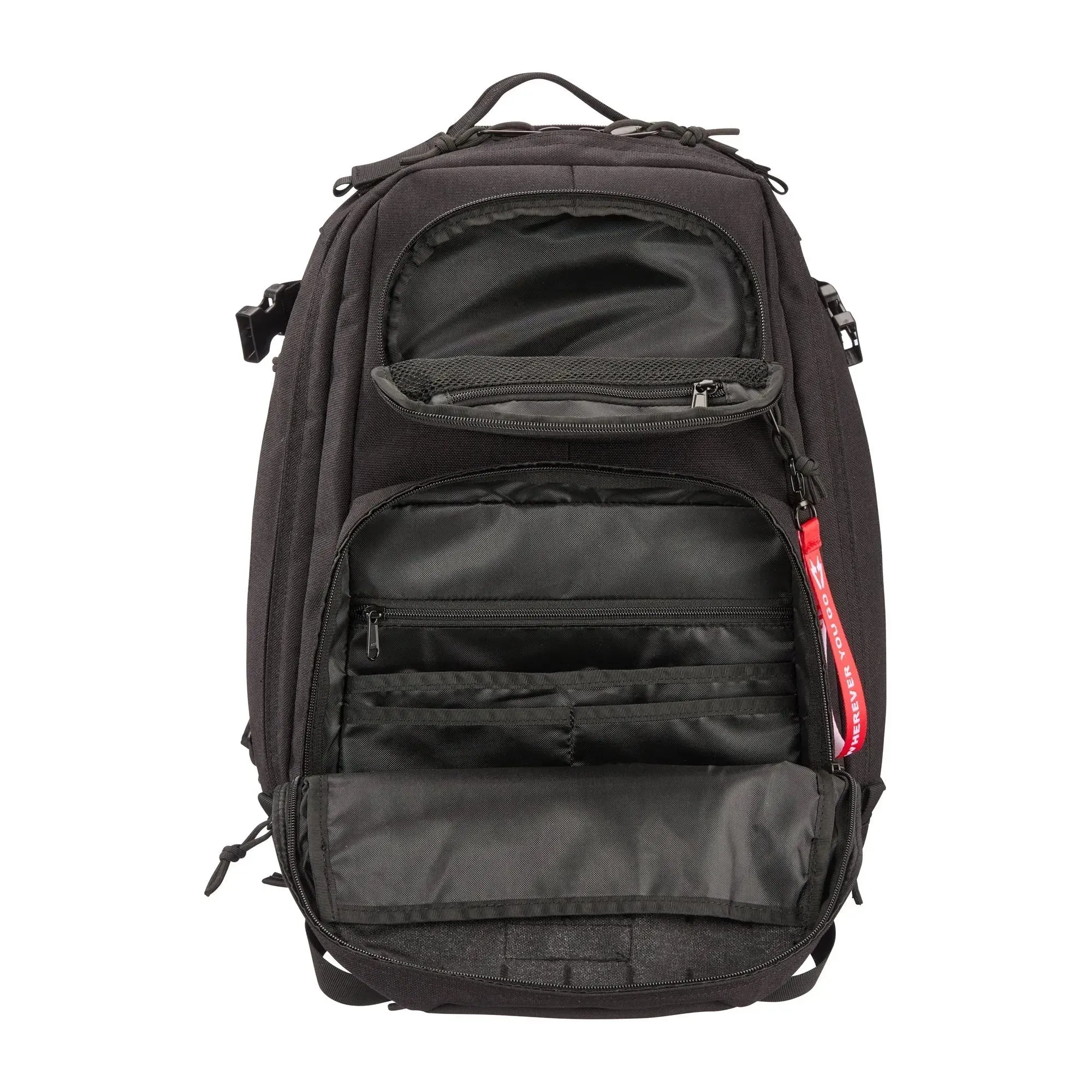 Das großzügige Hauptfach bietet ausreichend Platz für all Deine Ausrüstung, während die zwei aufgesetzten Fronttaschen mit (Netz-)Fächern unterteilt sind, damit Du schnell auf wichtige Gegenstände zugreifen kannst. Eine weitere gepolsterte Reißverschlusstasche am Tragegriff oben eignet sich perfekt für Deine Sonnenbrille oder Dein Smartphone.