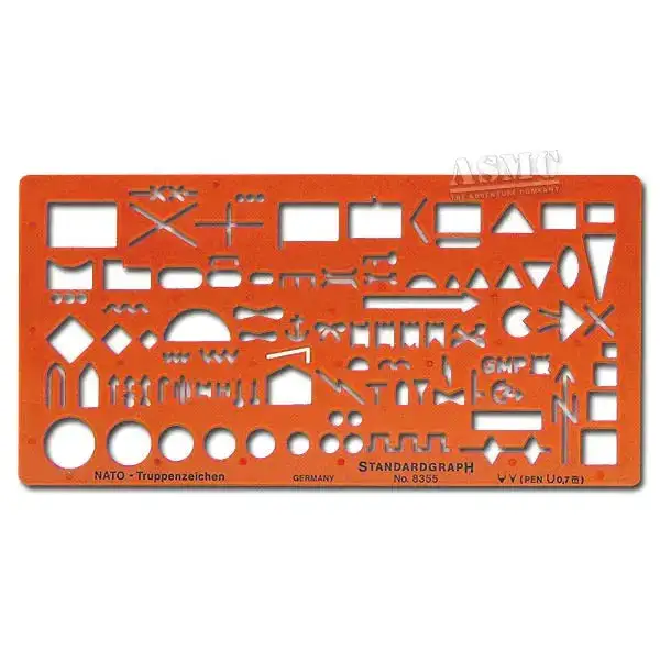 Die Schablone NATO Truppenzeichen enthält natostandartisierte Truppen- und Waffensymbole. Besonders zur Nutzung auf Karten und Lageplänen geeignet. Es eignen sich am besten Stifte mit besonder feiner Spitze (0,7 mm) sowie Bleistifte.