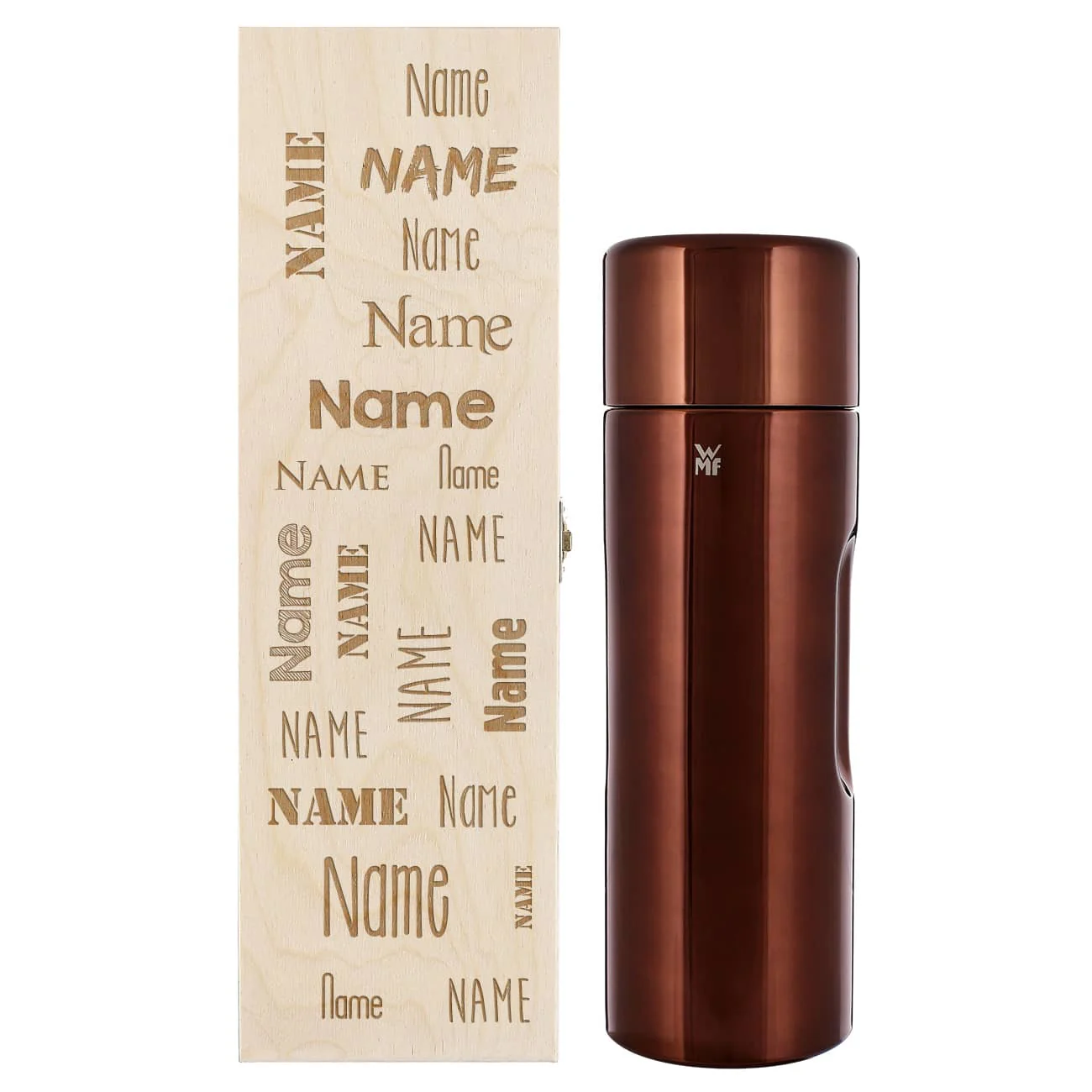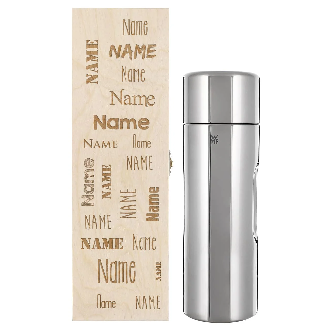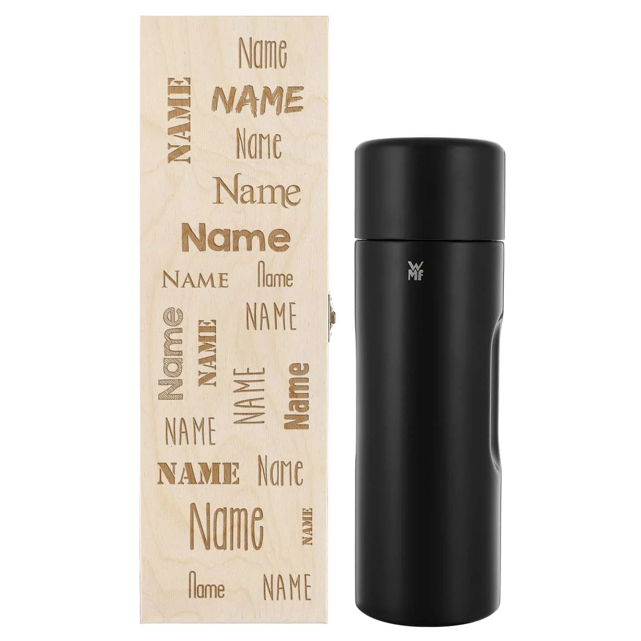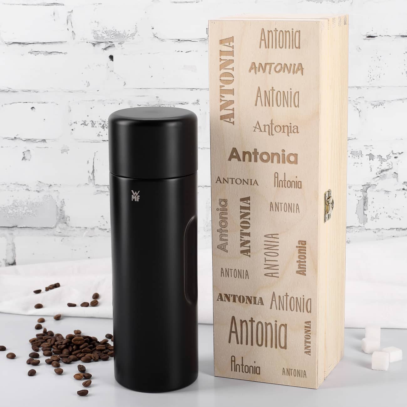 Dazu gibt es eine persönlich gravierte Holzbox. Ihr Wunschname steht in vielen verschiedenen Schriftarten auf dem Deckel der Box.